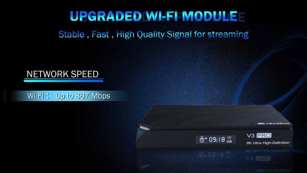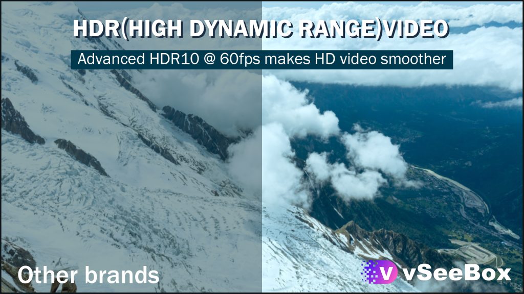 vSeeBox V3 Pro supports HDR10 technologies and HDMI2.0 frame rate can go up to 60fps. With HDR technology you can watch HDR videos in vivid contrast, color and clarity. Enjoy the incredible picture crispness and dramatic detail 4K Ultra HD and 1080p resolution.
